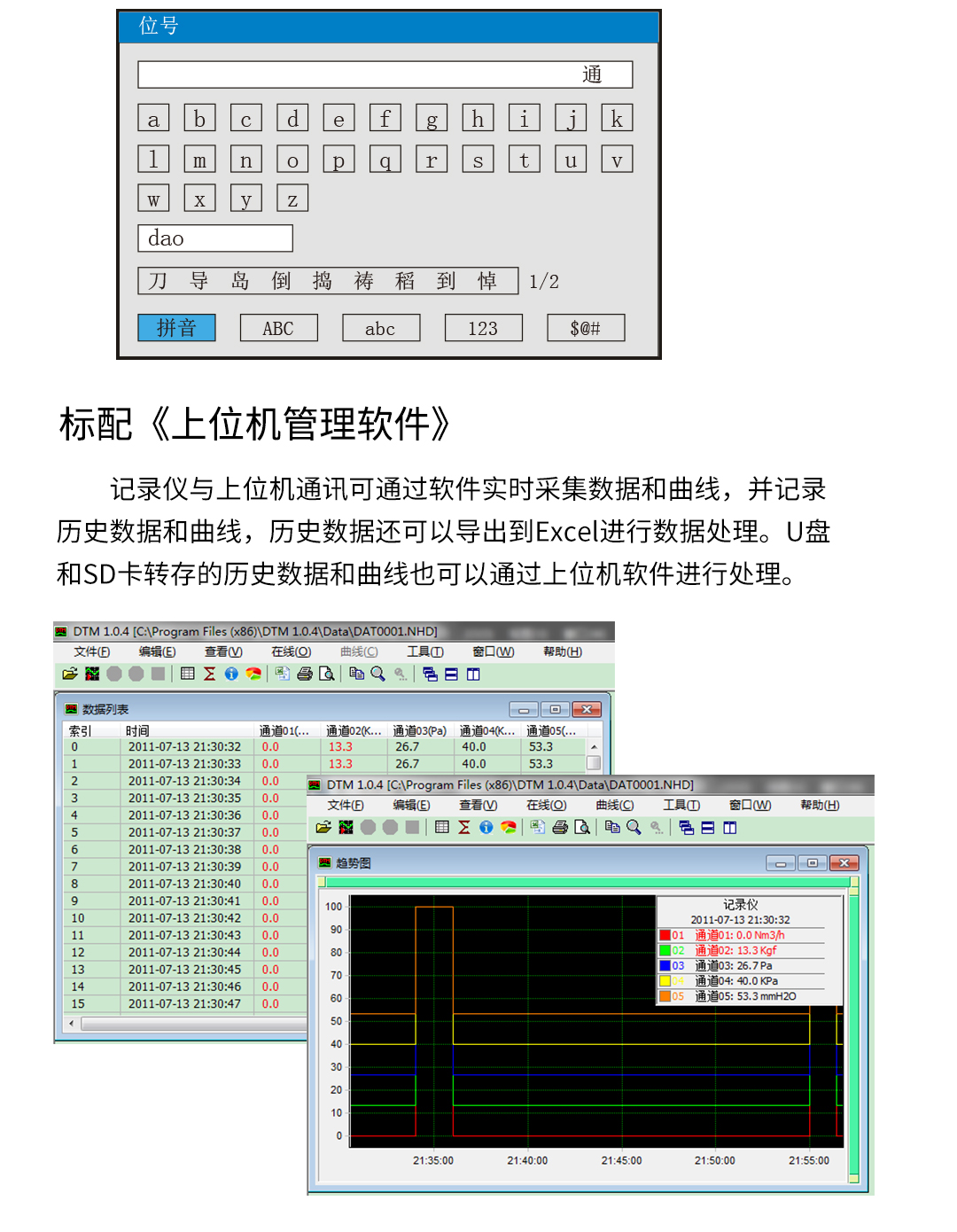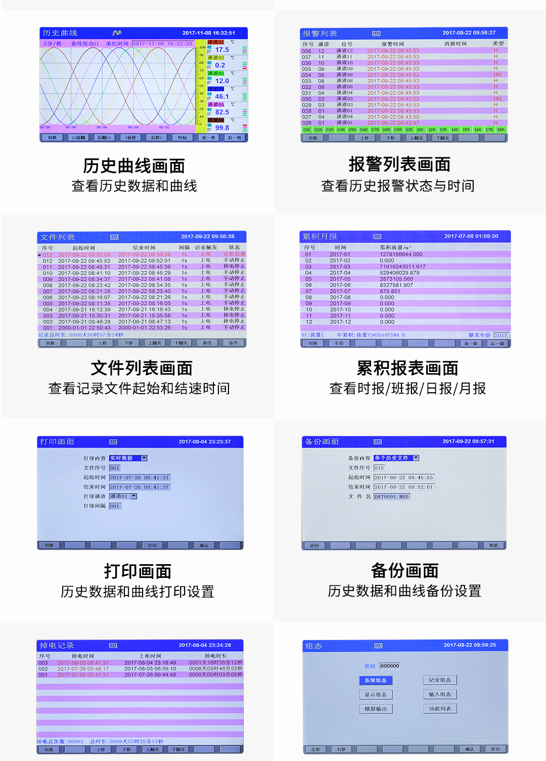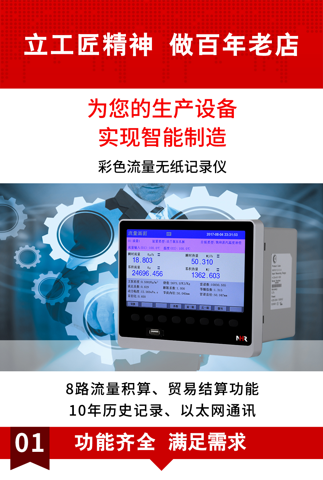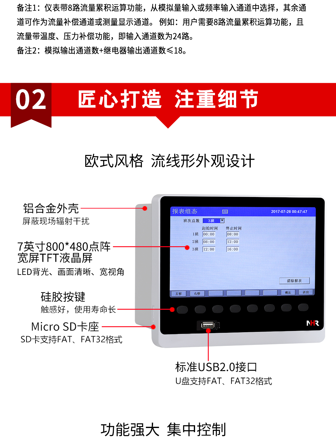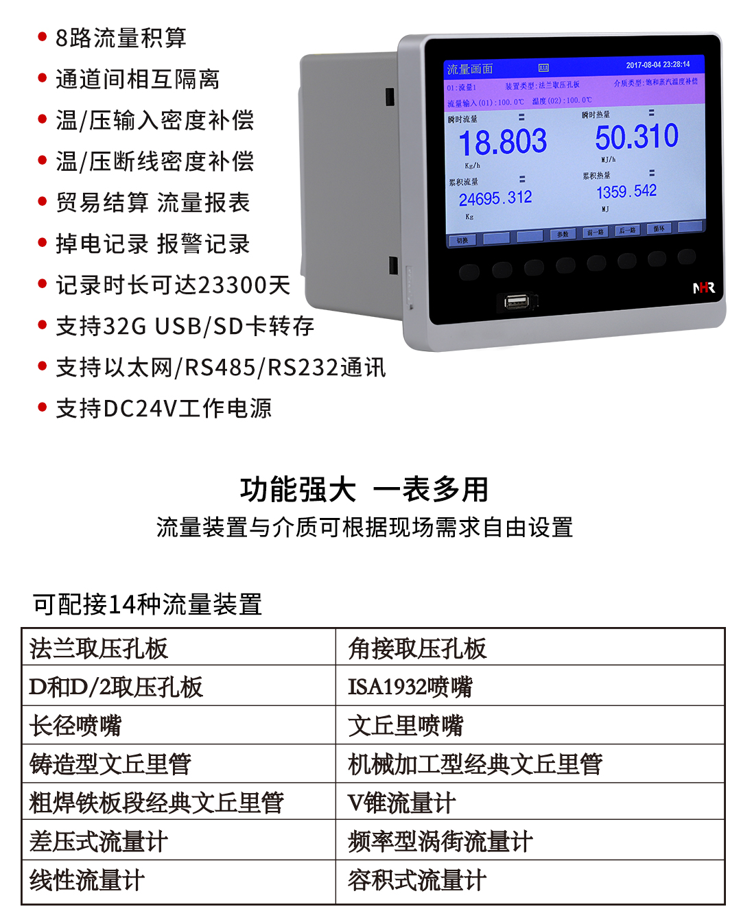 NHR-8600系列8路彩色流量无纸记录仪支持24路万能输入其中可带8路流量输入。具有继电器报警输出,变送输出,流量积算,温压补偿功能;可带RS232/485通讯接口,以太网接口,微型打印机和USB接口,SD卡插座;可提供传感器配电;具有强大的显示功能,实时曲线显示,历史曲线追忆,棒图显示,报警状态显示,流量显示。