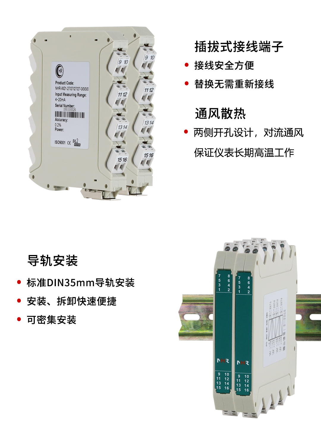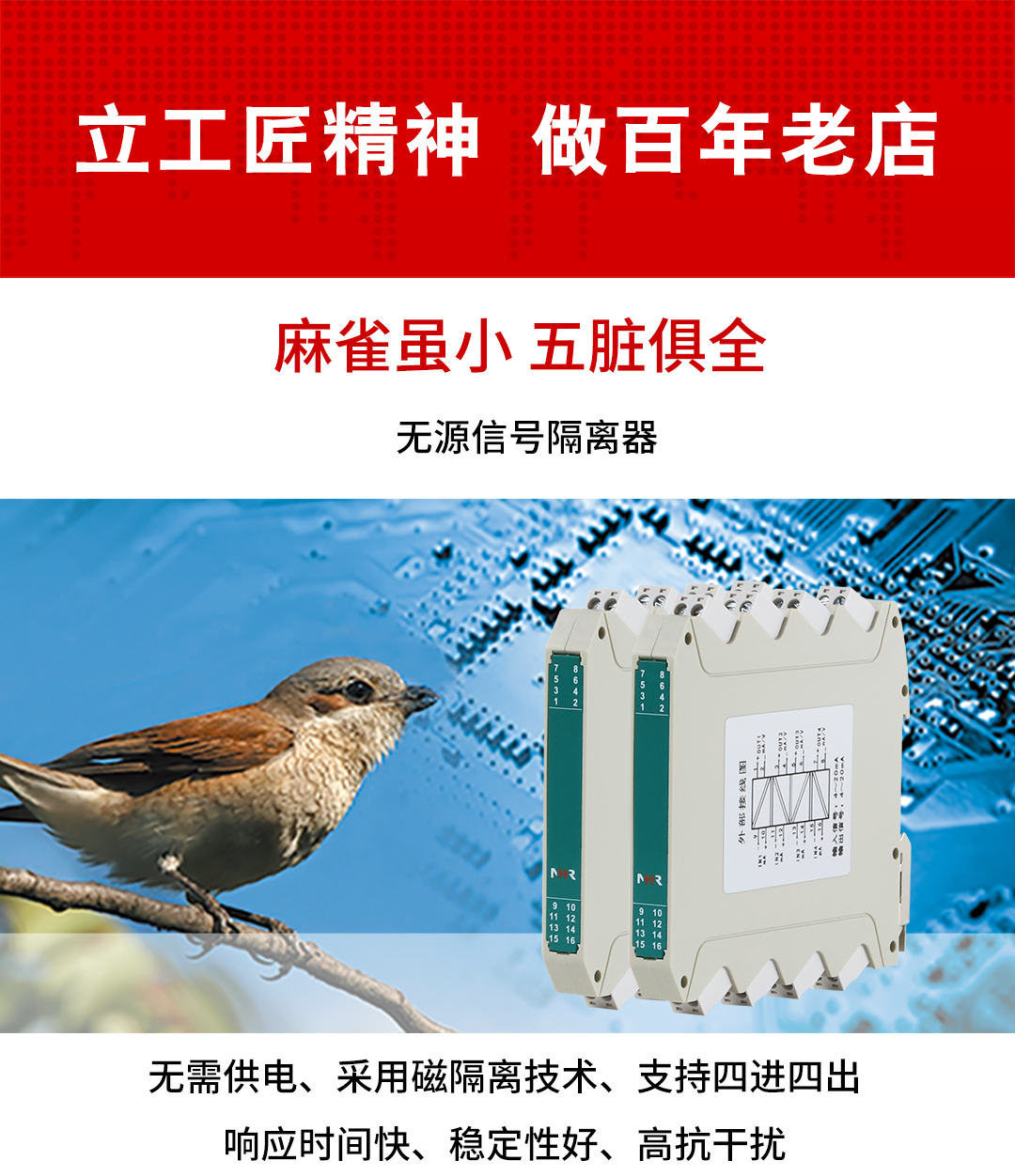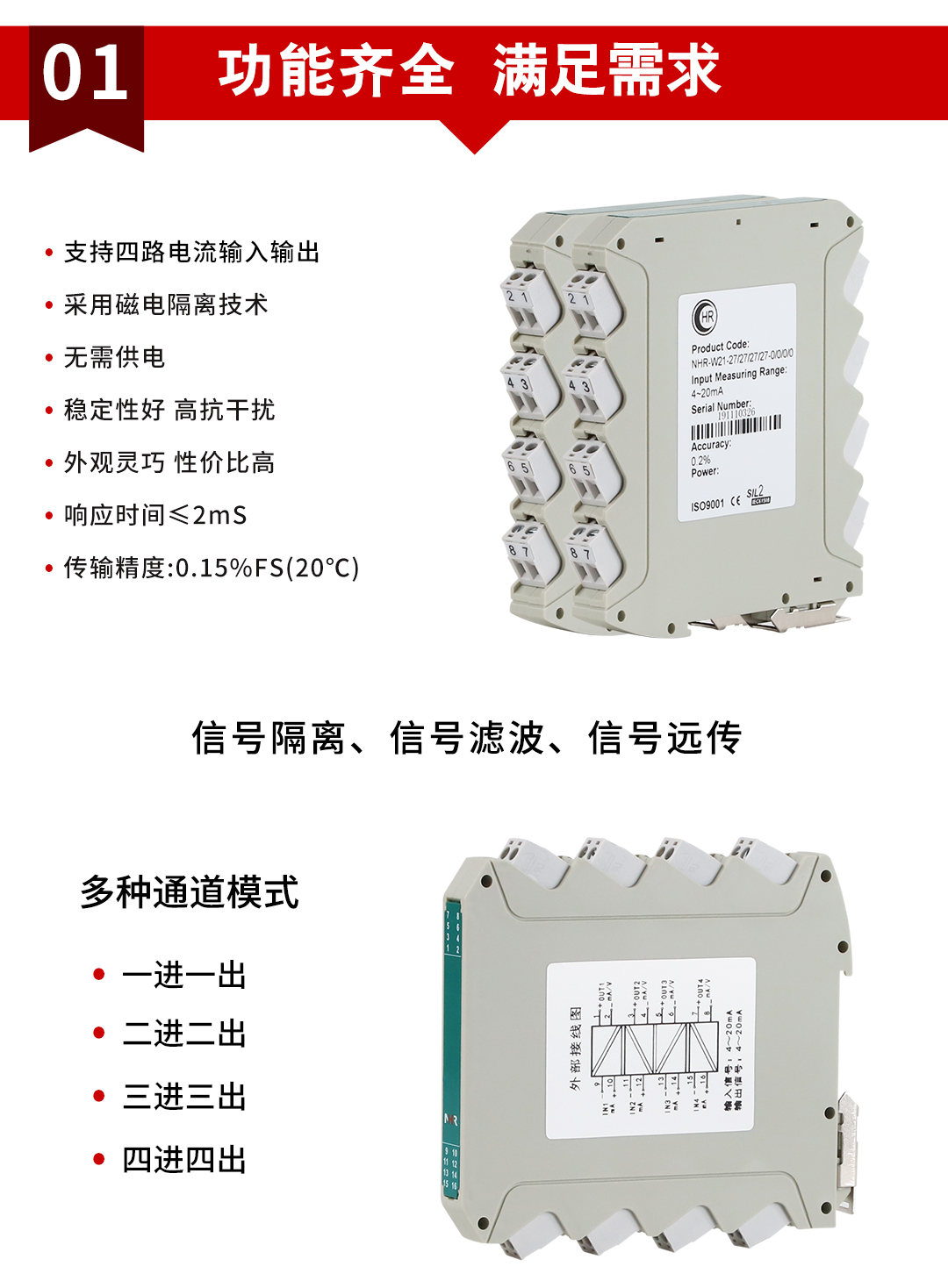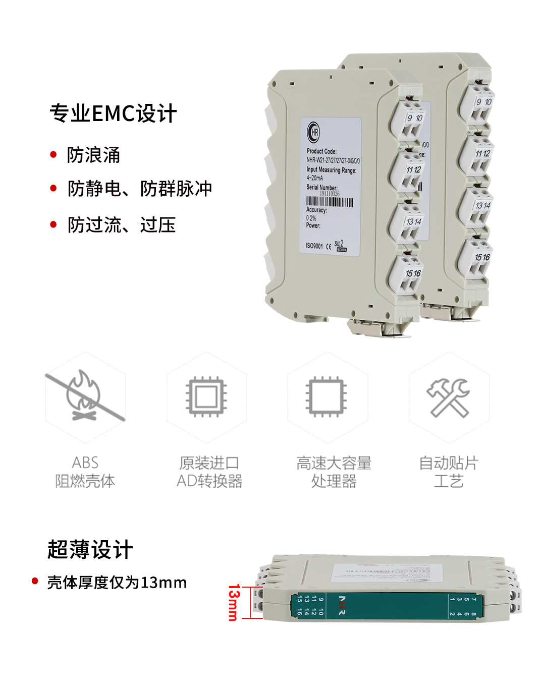 NHR-W21系列无源信号隔离器无源信号隔离器无需外供电源,由输入回路供电,实现信号隔离。可以与各种工业传感器、现场仪表配合,取回参数信号,隔离变送传输,满足用户本地监视远程数据的需求。本产品品种分为一进一出、两进两出、三进三出、四进四出,且输入、输出磁隔离。