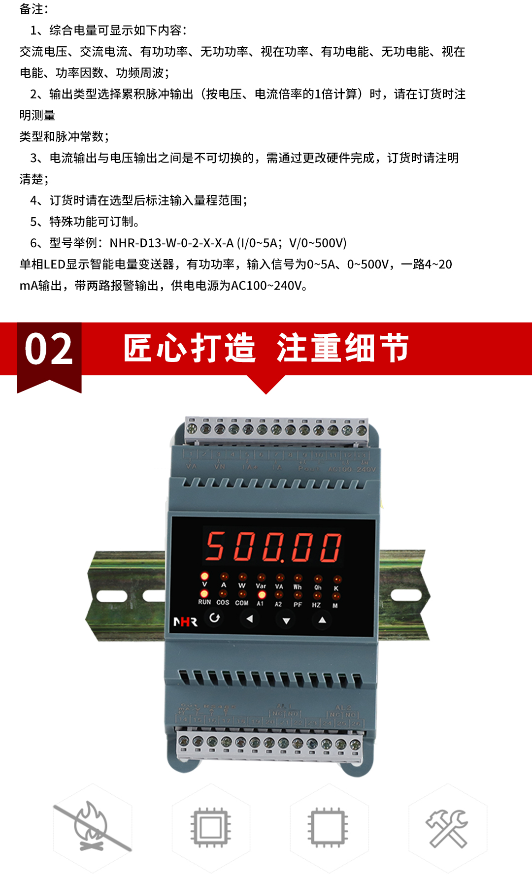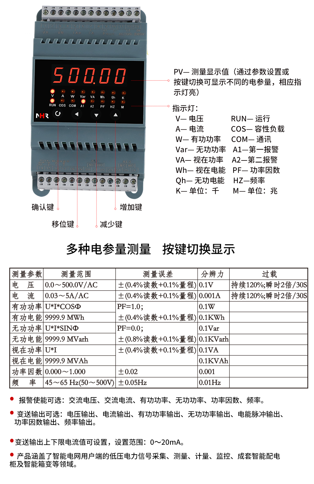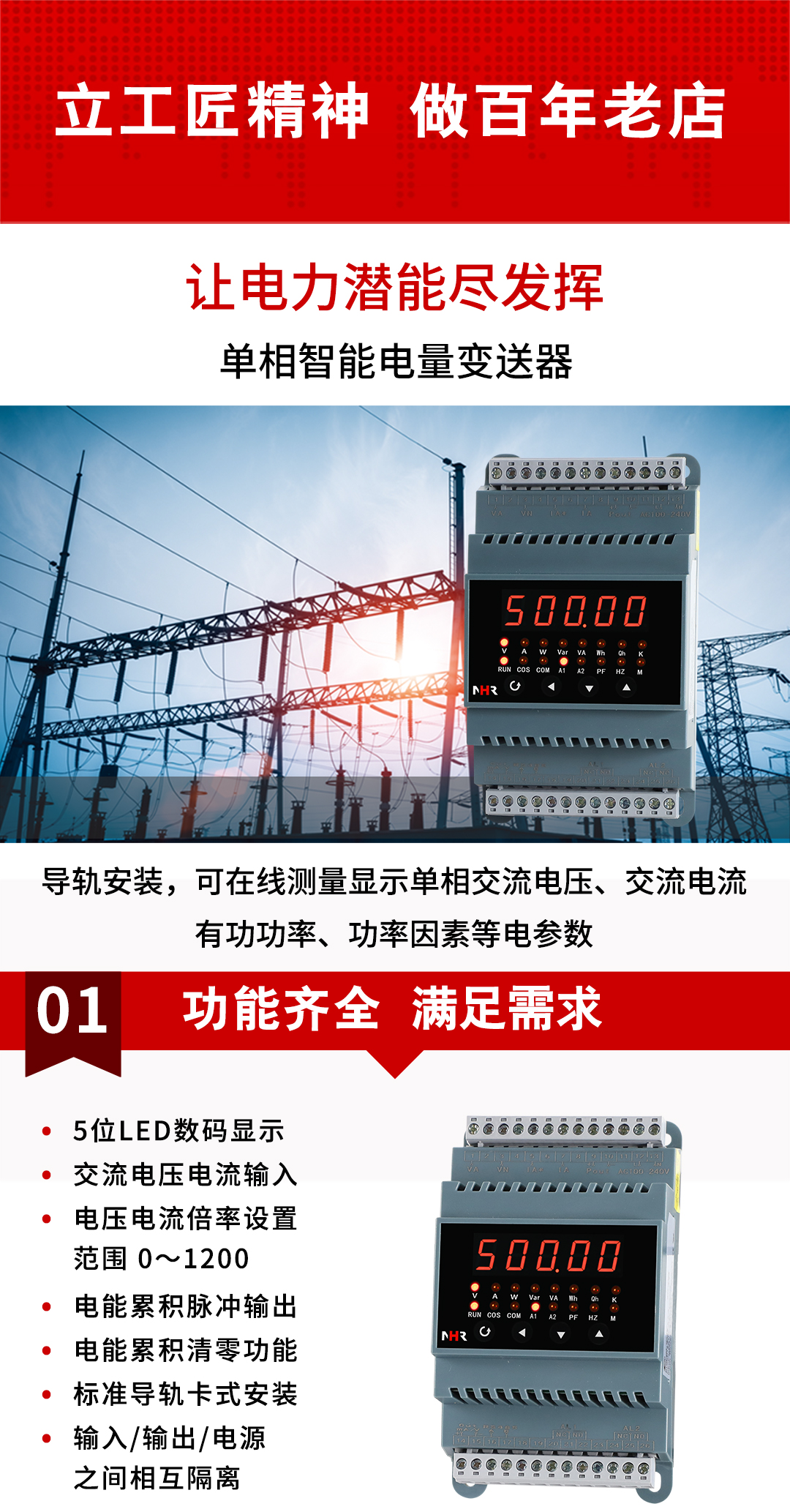 NHR-D13系列单相LED显示智能电量变送器是一款高性价比的智能电参数变送器,采用大规模集成电路,以低功耗的微处理器为核心,带五位LED数码显示及报警指示灯指示,配备按键操作更加方便。